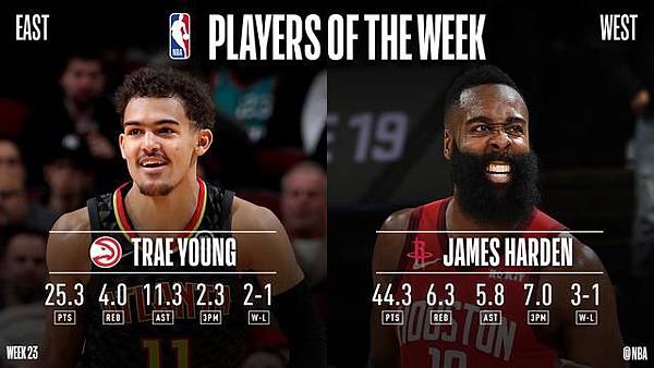 NBA官方公佈上周東西區最佳球員,亞特蘭大老鷹隊後衛特雷-楊恩與休士頓火箭隊後衛詹姆斯-哈登分別鑊選。