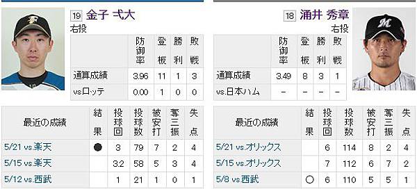 今日上演兩大強投的對決,在數據上不難看出,金子近三戰都僅出賽不滿五局,近兩戰平均3.1局投球丟失4分,狀況不算穩定,本季與羅德交手一場1局的投球無失分,被敲出一支安打防禦率0,湧井部分除了上一戰面對歐力士三局丟掉四分外,近四戰的投球場均丟分不到2分,投球內容在水準之上,涌井具有獨立撐完6-7局的實力。